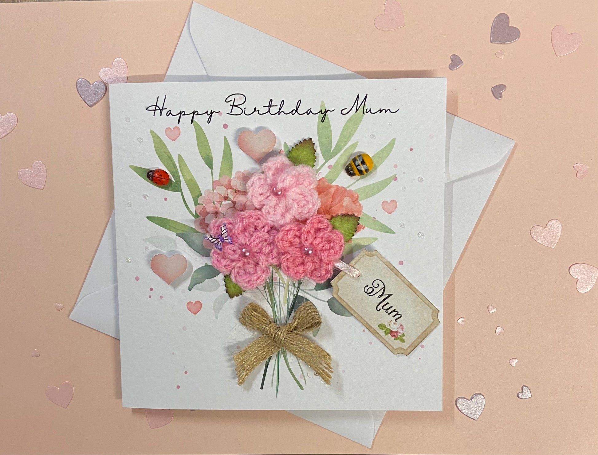 Handmade with love and care from lovely white textured card embellished with simple bouquet design, embellished with me made crochet flowers with pearl centres and finished with resin butterfly and super cute wooden bee and ladybird, the birthday card measures approximately 6” x 6” and is made with 300gsm textured card and comes with a matching envelope and gold heart sticker to help seal the envelope the card is blank inside to add your own sentiments, card will be posted in a biodegradable cellophane sleeve and packaged in a hard backed do not bend envelope.